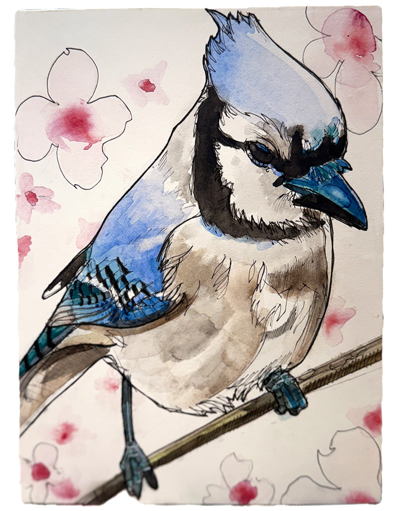 Blue Jay illustration drawn in India ink and colored with watercolor on cold press watercolor paper.