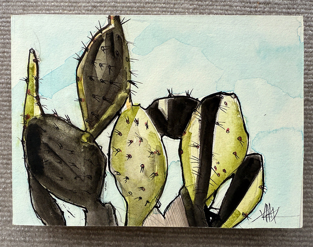 Cacti is drawn in ink and colored with watercolor on cold press watercolor paper.