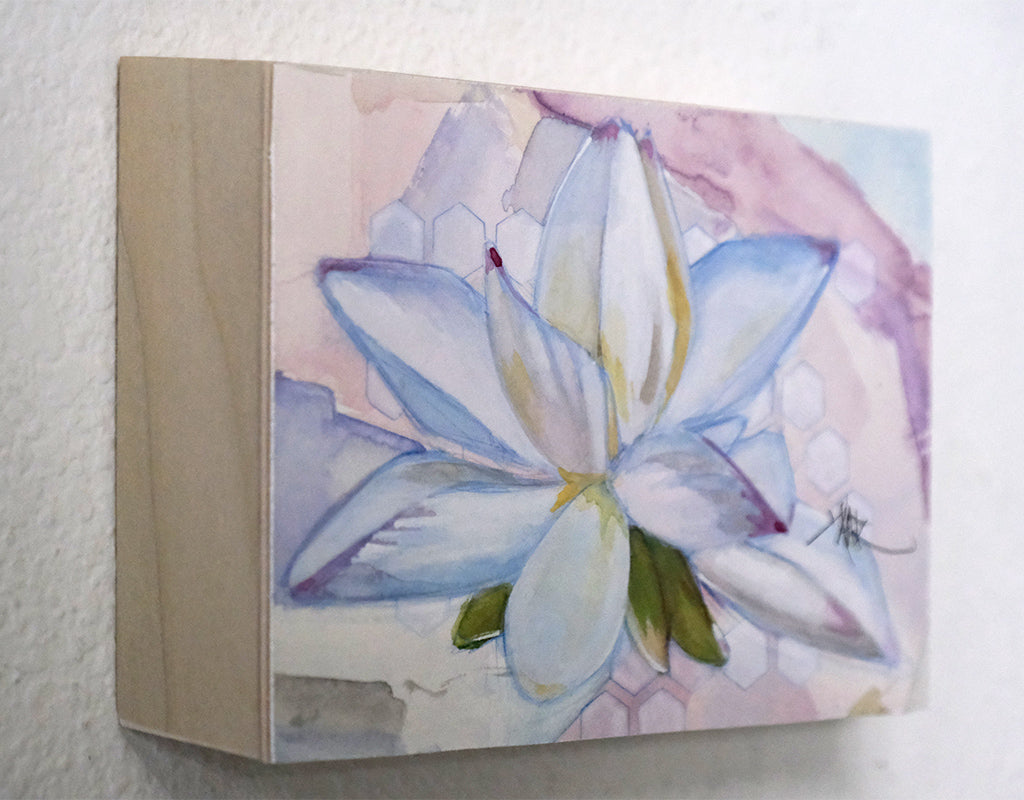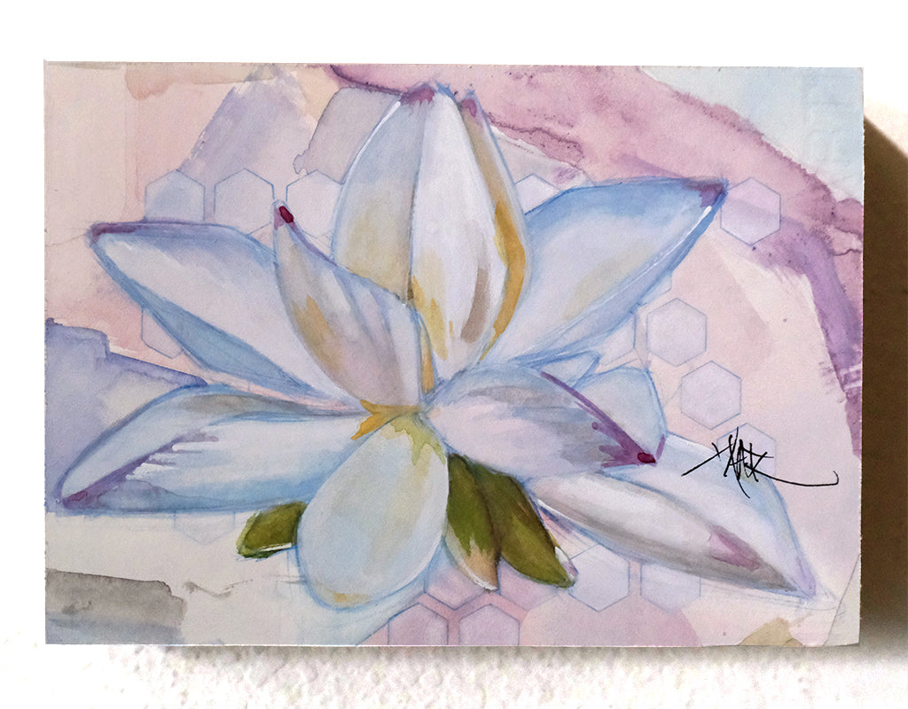 Lotus flower illustration drawn in India ink and colored with watercolor on cold press watercolor paper.