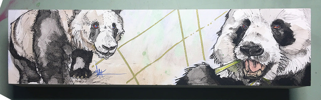 Panda illustration drawn in India ink and colored with watercolor and acrylic marker on cold press watercolor paper.