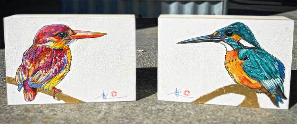 Each are drawn in ink and colored with watercolor on cold press watercolor paper with gold leaf highlights. Mounted to 1.58" cradled wood panel.