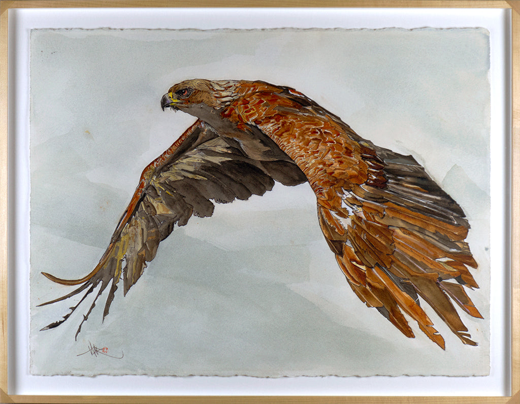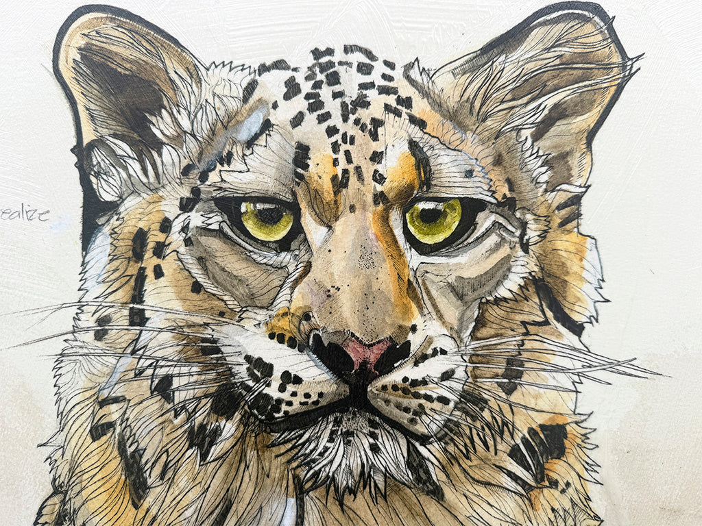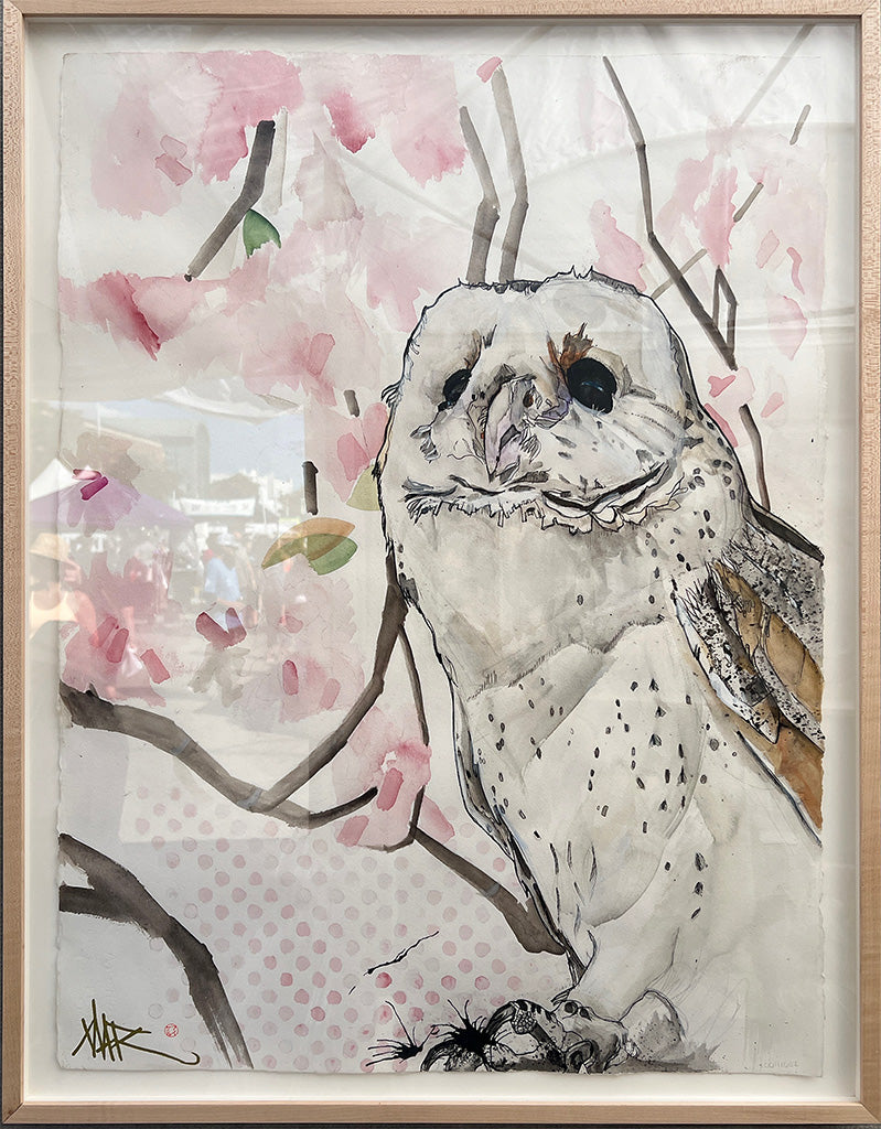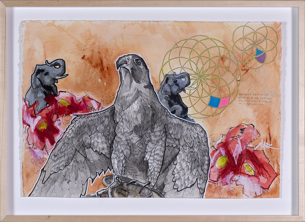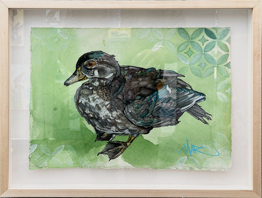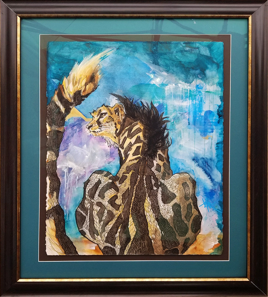 Original works are spray varnished then usually float mounted in custom cut frames set behind museum quality glass or acrylic, and sometimes they are flush mounted to a cradled wood panel and displayed with out glass.