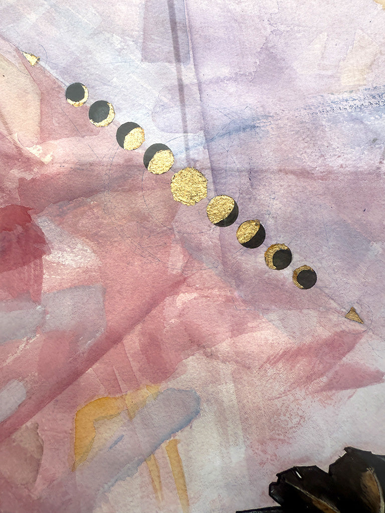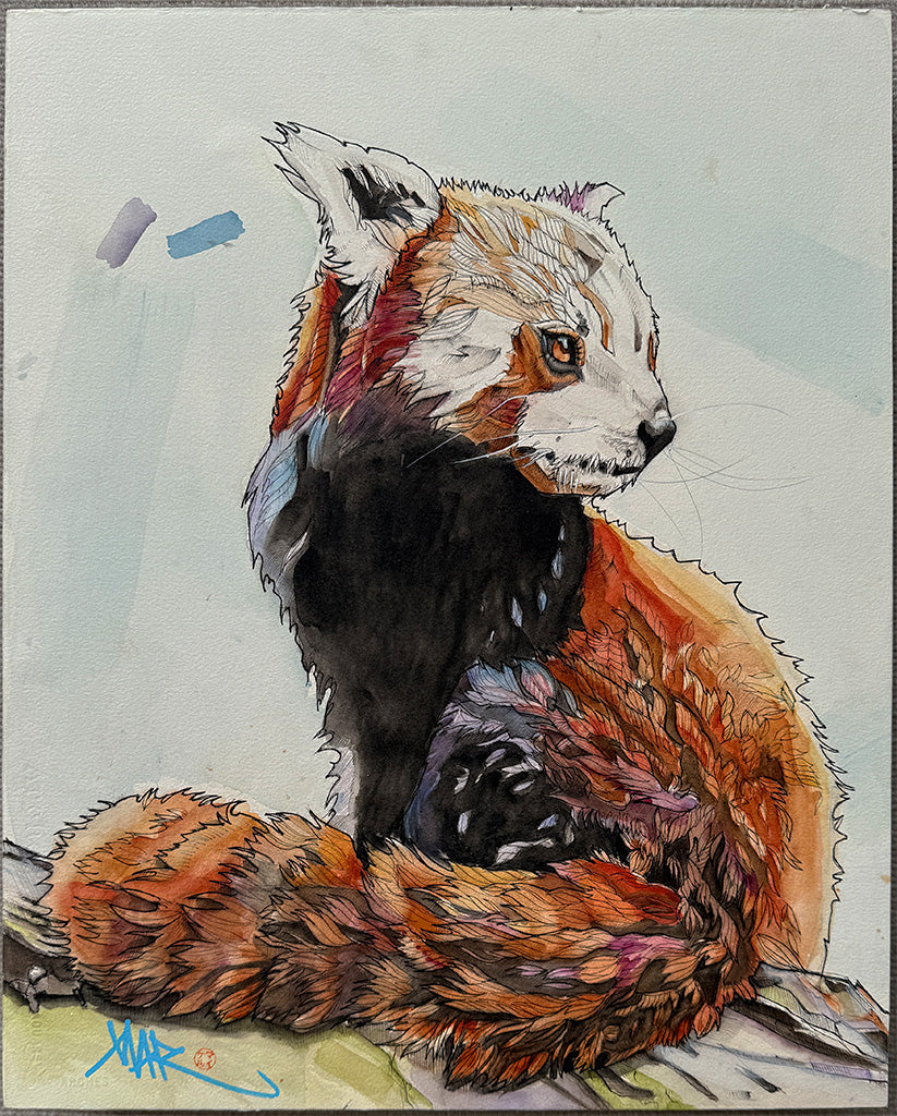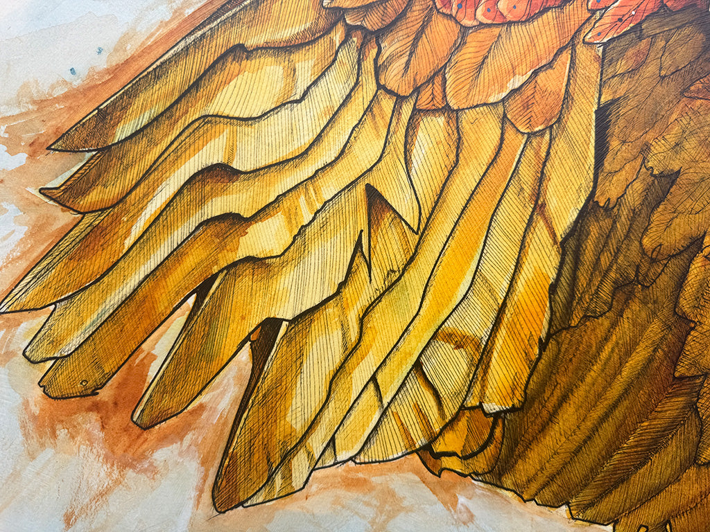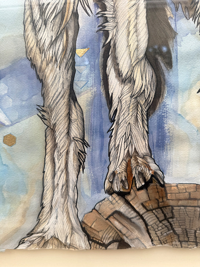 I draw detailed ink illustrations on watercolor paper, then color in with layers of watercolor. In the past, I colored with alcohol-based markers, which I occasionally still employ. Many of the pieces are finished with highlights of gold leaf, acrylic marker, or oil pastel.