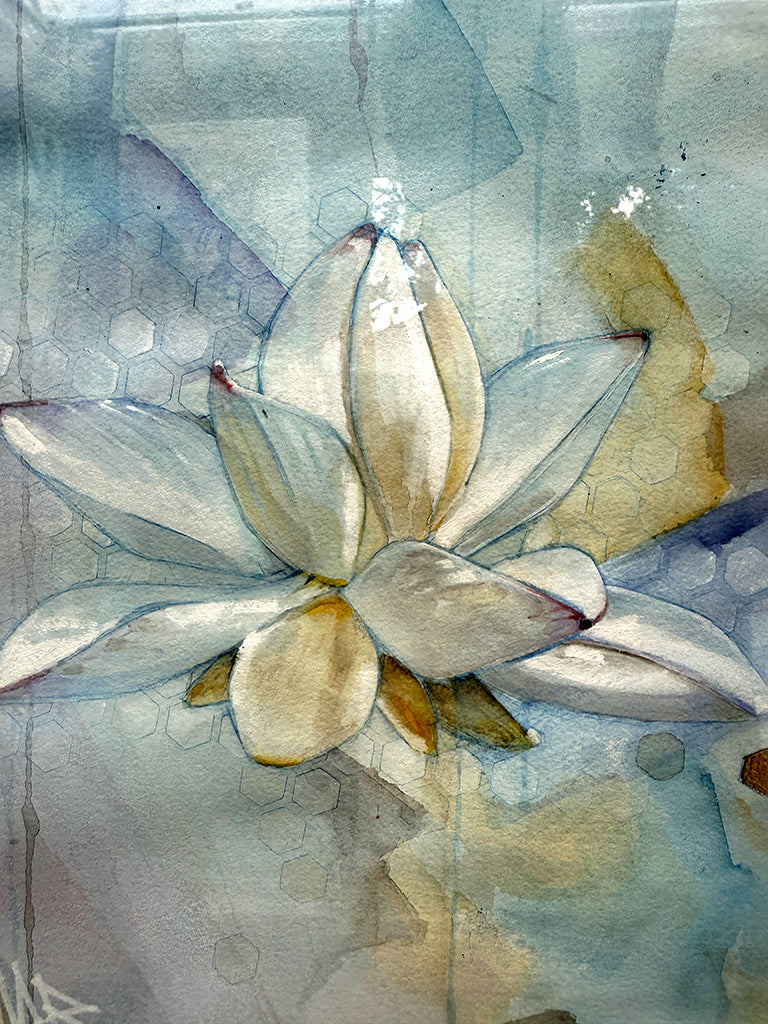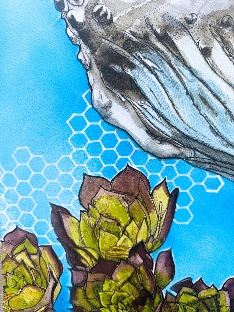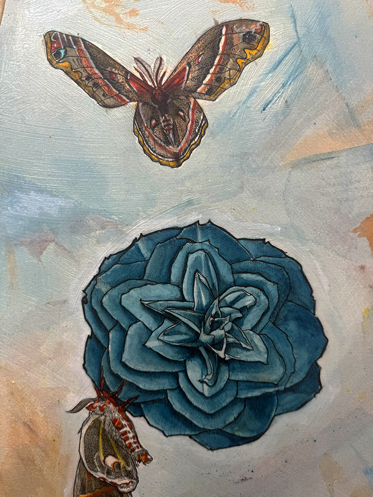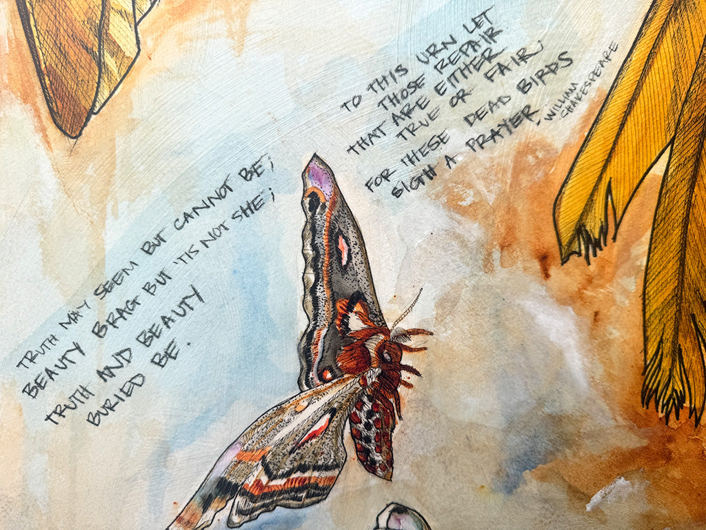 I draw detailed ink illustrations on watercolor paper, then color in with layers of watercolor. In the past, I colored with alcohol-based markers, which I occasionally still employ. Many of the pieces are finished with highlights of gold leaf, acrylic marker, or oil pastel.