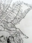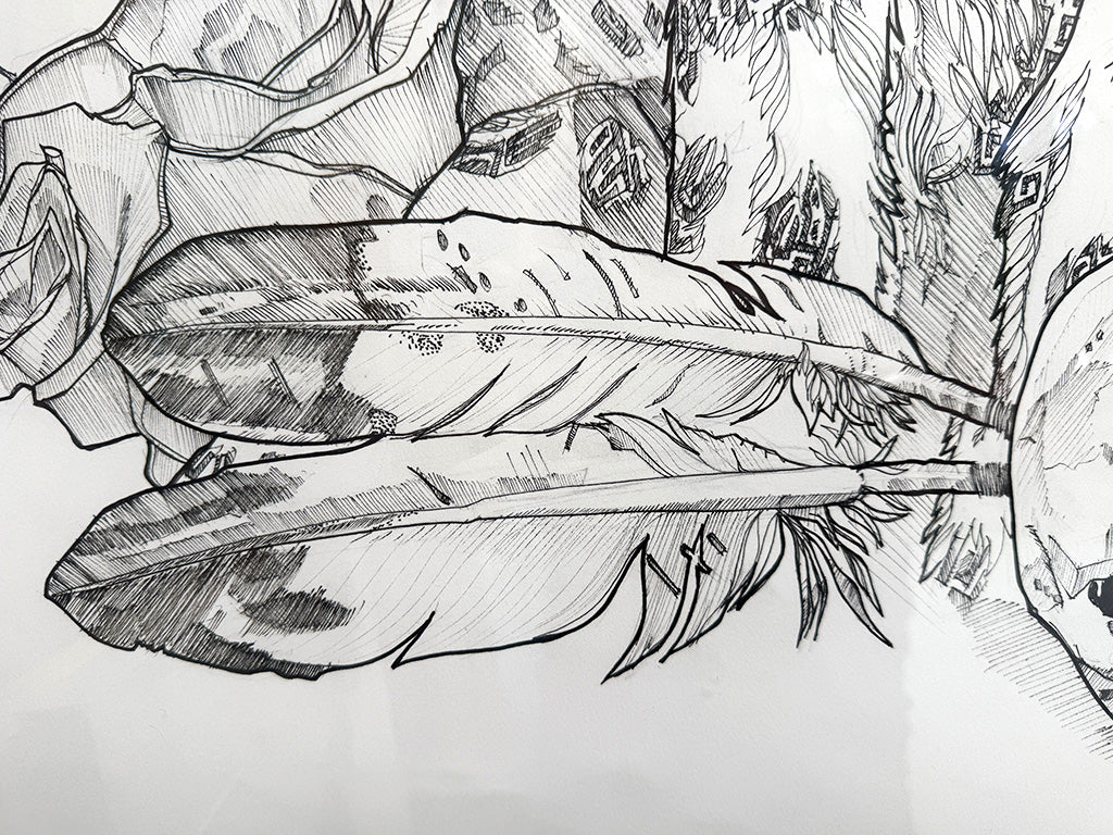 (2020) 30" x 44" Ink illustration on hot press watercolor paper with gold leaf embellishment. Float mounted in a custom cut frame set behind museum quality clear acrylic.