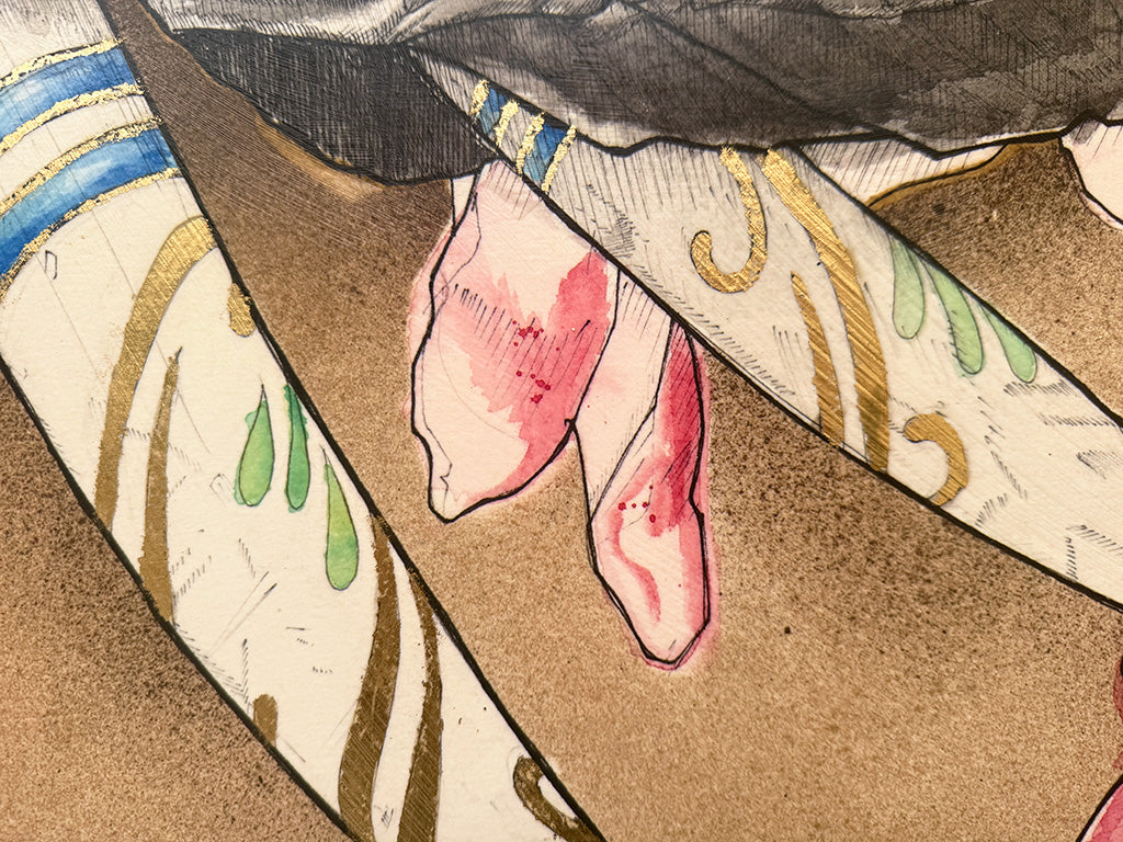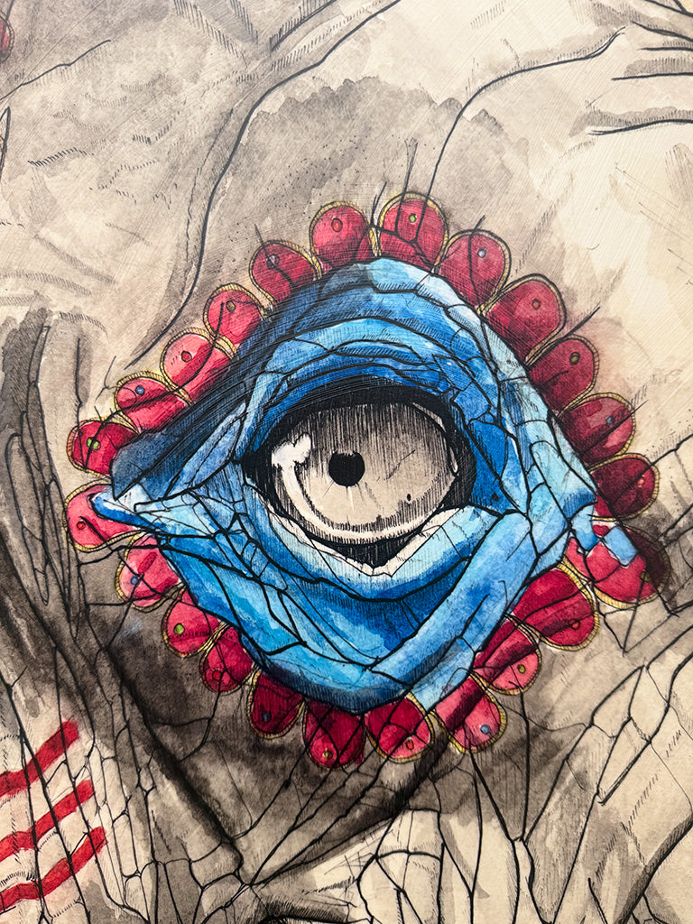 (2015) 22" x 30" Ink, watercolor and spray paint illustration on cold press watercolor paper. Float mounted in a custom cut frame set behind museum quality clear glass.