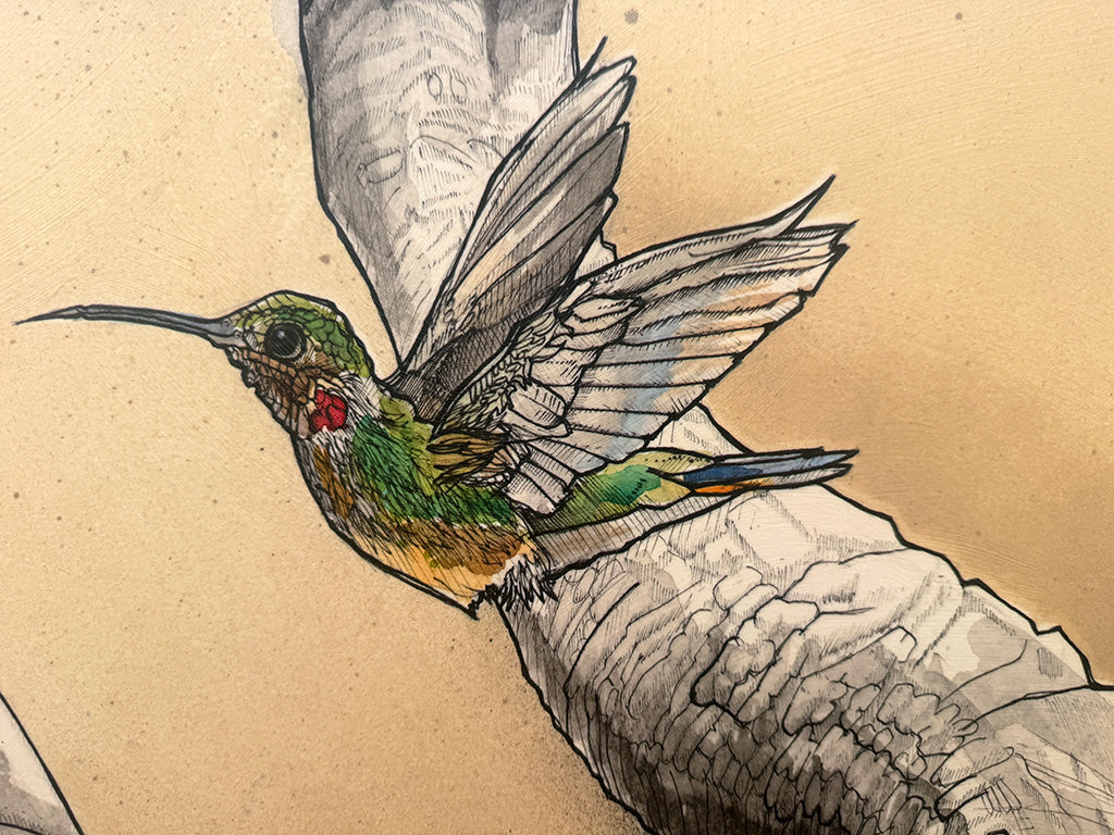 Original works are spray varnished then usually float mounted in custom cut frames set behind museum quality glass or acrylic, and sometimes they are flush mounted to a cradled wood panel and displayed with out glass.