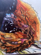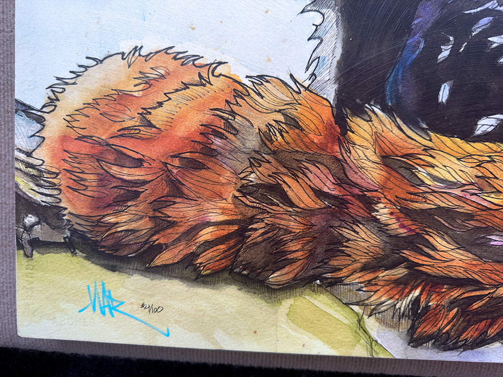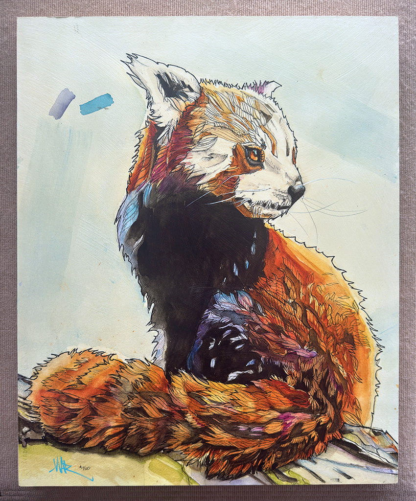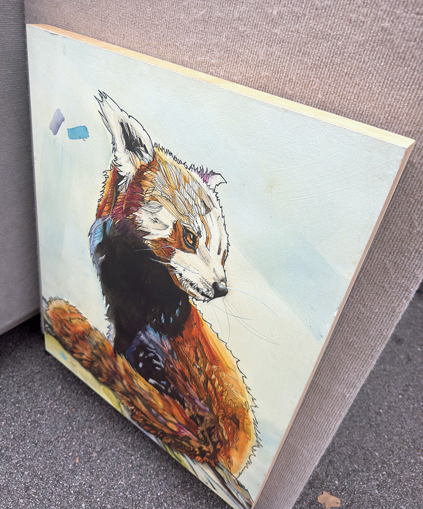 "Joy Luck Club" red panda mounted on cradled wood panel. The reproductions are hand embellished with an acrylic medium for finish and protection and are ready to hang. All mounted reproductions are limited edition, signed and numbered by the artist.