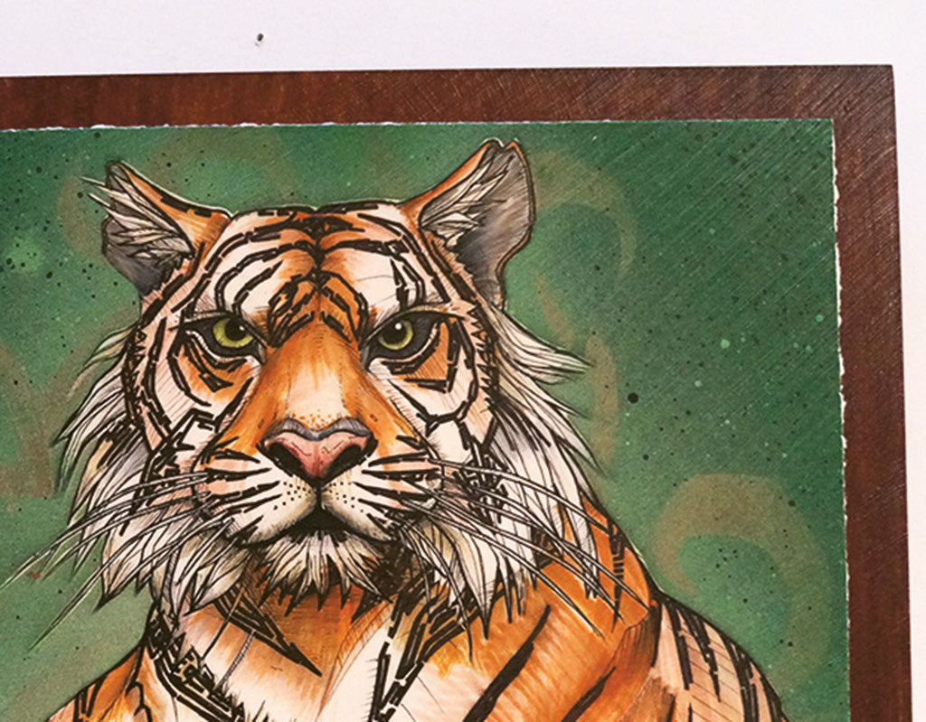 "Sumatran Tiger" dry mounted to cradled wood panel. UV varnished, clear coated, and ready to hang!